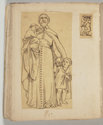 Album Gatteaux dit "musée imaginaire". Album factice à couverture en vélin. Feuillets de deux papiers différents du fait de l'usage d'un papier plus fort et moins homogène pour le premier feuillet, puis du folio 36 recto au folio 40 verso. Au total 599 dessins répartis sur les premiers 134 feuillets. 596 dessins collés sur les pages de l'album et 3 dessins exécutés à même les pages de l'album. 592 dessins rapportés exécutés sur calque et 4 dessins rapportés exécutés sur papier. 23 dessins exécutés uniquement au graphite sur papier ou calque. 24 dessins exécutés à l'encre brune et/ou noire sur traces de graphite.552 dessins exécutés à l'encre seule, majoritairement brune mais de qualités différentes, parfois plus grise, d'autres fois plus noire. Plusieurs ensembles de feuillets vierges : du folio 30 recto au folio 35 verso inclus ; du folio 65 verso au feuillet 68 recto inclus ; du feuillet 72 verso au 75 verso inclus ; du feuillet 129 recto au feuillet 130 verso inclus. Feuillets vierges ou coupés à partir du folio 135 verso. Annotation à la plume et à l'encre brune de la main de Jacques-Edouard Gatteaux sur la contre-garde de la couverture: " E. Gatteaux. Rue de Bourbon n° 36 / Paris". Dimensions de l'album : H. 21 cm.; L. 17 cm. ; épaisseur du dos environ 3,2 cm.