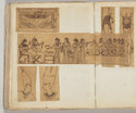 Album Gatteaux dit "musée imaginaire". Album factice à couverture en vélin. Feuillets de deux papiers différents du fait de l'usage d'un papier plus fort et moins homogène pour le premier feuillet, puis du folio 36 recto au folio 40 verso. Au total 599 dessins répartis sur les premiers 134 feuillets. 596 dessins collés sur les pages de l'album et 3 dessins exécutés à même les pages de l'album. 592 dessins rapportés exécutés sur calque et 4 dessins rapportés exécutés sur papier. 23 dessins exécutés uniquement au graphite sur papier ou calque. 24 dessins exécutés à l'encre brune et/ou noire sur traces de graphite.552 dessins exécutés à l'encre seule, majoritairement brune mais de qualités différentes, parfois plus grise, d'autres fois plus noire. Plusieurs ensembles de feuillets vierges : du folio 30 recto au folio 35 verso inclus ; du folio 65 verso au feuillet 68 recto inclus ; du feuillet 72 verso au 75 verso inclus ; du feuillet 129 recto au feuillet 130 verso inclus. Feuillets vierges ou coupés à partir du folio 135 verso. Annotation à la plume et à l'encre brune de la main de Jacques-Edouard Gatteaux sur la contre-garde de la couverture: " E. Gatteaux. Rue de Bourbon n° 36 / Paris". Dimensions de l'album : H. 21 cm.; L. 17 cm. ; épaisseur du dos environ 3,2 cm.