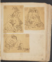 Album Gatteaux dit "musée imaginaire". Album factice à couverture en vélin. Feuillets de deux papiers différents du fait de l'usage d'un papier plus fort et moins homogène pour le premier feuillet, puis du folio 36 recto au folio 40 verso. Au total 599 dessins répartis sur les premiers 134 feuillets. 596 dessins collés sur les pages de l'album et 3 dessins exécutés à même les pages de l'album. 592 dessins rapportés exécutés sur calque et 4 dessins rapportés exécutés sur papier. 23 dessins exécutés uniquement au graphite sur papier ou calque. 24 dessins exécutés à l'encre brune et/ou noire sur traces de graphite.552 dessins exécutés à l'encre seule, majoritairement brune mais de qualités différentes, parfois plus grise, d'autres fois plus noire. Plusieurs ensembles de feuillets vierges : du folio 30 recto au folio 35 verso inclus ; du folio 65 verso au feuillet 68 recto inclus ; du feuillet 72 verso au 75 verso inclus ; du feuillet 129 recto au feuillet 130 verso inclus. Feuillets vierges ou coupés à partir du folio 135 verso. Annotation à la plume et à l'encre brune de la main de Jacques-Edouard Gatteaux sur la contre-garde de la couverture: " E. Gatteaux. Rue de Bourbon n° 36 / Paris". Dimensions de l'album : H. 21 cm.; L. 17 cm. ; épaisseur du dos environ 3,2 cm.