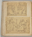 Album Gatteaux dit "musée imaginaire". Album factice à couverture en vélin. Feuillets de deux papiers différents du fait de l'usage d'un papier plus fort et moins homogène pour le premier feuillet, puis du folio 36 recto au folio 40 verso. Au total 599 dessins répartis sur les premiers 134 feuillets. 596 dessins collés sur les pages de l'album et 3 dessins exécutés à même les pages de l'album. 592 dessins rapportés exécutés sur calque et 4 dessins rapportés exécutés sur papier. 23 dessins exécutés uniquement au graphite sur papier ou calque. 24 dessins exécutés à l'encre brune et/ou noire sur traces de graphite.552 dessins exécutés à l'encre seule, majoritairement brune mais de qualités différentes, parfois plus grise, d'autres fois plus noire. Plusieurs ensembles de feuillets vierges : du folio 30 recto au folio 35 verso inclus ; du folio 65 verso au feuillet 68 recto inclus ; du feuillet 72 verso au 75 verso inclus ; du feuillet 129 recto au feuillet 130 verso inclus. Feuillets vierges ou coupés à partir du folio 135 verso. Annotation à la plume et à l'encre brune de la main de Jacques-Edouard Gatteaux sur la contre-garde de la couverture: " E. Gatteaux. Rue de Bourbon n° 36 / Paris". Dimensions de l'album : H. 21 cm.; L. 17 cm. ; épaisseur du dos environ 3,2 cm.