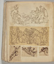 Album Gatteaux dit "musée imaginaire". Album factice à couverture en vélin. Feuillets de deux papiers différents du fait de l'usage d'un papier plus fort et moins homogène pour le premier feuillet, puis du folio 36 recto au folio 40 verso. Au total 599 dessins répartis sur les premiers 134 feuillets. 596 dessins collés sur les pages de l'album et 3 dessins exécutés à même les pages de l'album. 592 dessins rapportés exécutés sur calque et 4 dessins rapportés exécutés sur papier. 23 dessins exécutés uniquement au graphite sur papier ou calque. 24 dessins exécutés à l'encre brune et/ou noire sur traces de graphite.552 dessins exécutés à l'encre seule, majoritairement brune mais de qualités différentes, parfois plus grise, d'autres fois plus noire. Plusieurs ensembles de feuillets vierges : du folio 30 recto au folio 35 verso inclus ; du folio 65 verso au feuillet 68 recto inclus ; du feuillet 72 verso au 75 verso inclus ; du feuillet 129 recto au feuillet 130 verso inclus. Feuillets vierges ou coupés à partir du folio 135 verso. Annotation à la plume et à l'encre brune de la main de Jacques-Edouard Gatteaux sur la contre-garde de la couverture: " E. Gatteaux. Rue de Bourbon n° 36 / Paris". Dimensions de l'album : H. 21 cm.; L. 17 cm. ; épaisseur du dos environ 3,2 cm.