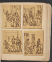 Album Gatteaux dit "musée imaginaire". Album factice à couverture en vélin. Feuillets de deux papiers différents du fait de l'usage d'un papier plus fort et moins homogène pour le premier feuillet, puis du folio 36 recto au folio 40 verso. Au total 599 dessins répartis sur les premiers 134 feuillets. 596 dessins collés sur les pages de l'album et 3 dessins exécutés à même les pages de l'album. 592 dessins rapportés exécutés sur calque et 4 dessins rapportés exécutés sur papier. 23 dessins exécutés uniquement au graphite sur papier ou calque. 24 dessins exécutés à l'encre brune et/ou noire sur traces de graphite.552 dessins exécutés à l'encre seule, majoritairement brune mais de qualités différentes, parfois plus grise, d'autres fois plus noire. Plusieurs ensembles de feuillets vierges : du folio 30 recto au folio 35 verso inclus ; du folio 65 verso au feuillet 68 recto inclus ; du feuillet 72 verso au 75 verso inclus ; du feuillet 129 recto au feuillet 130 verso inclus. Feuillets vierges ou coupés à partir du folio 135 verso. Annotation à la plume et à l'encre brune de la main de Jacques-Edouard Gatteaux sur la contre-garde de la couverture: " E. Gatteaux. Rue de Bourbon n° 36 / Paris". Dimensions de l'album : H. 21 cm.; L. 17 cm. ; épaisseur du dos environ 3,2 cm.