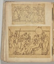 Album Gatteaux dit "musée imaginaire". Album factice à couverture en vélin. Feuillets de deux papiers différents du fait de l'usage d'un papier plus fort et moins homogène pour le premier feuillet, puis du folio 36 recto au folio 40 verso. Au total 599 dessins répartis sur les premiers 134 feuillets. 596 dessins collés sur les pages de l'album et 3 dessins exécutés à même les pages de l'album. 592 dessins rapportés exécutés sur calque et 4 dessins rapportés exécutés sur papier. 23 dessins exécutés uniquement au graphite sur papier ou calque. 24 dessins exécutés à l'encre brune et/ou noire sur traces de graphite.552 dessins exécutés à l'encre seule, majoritairement brune mais de qualités différentes, parfois plus grise, d'autres fois plus noire. Plusieurs ensembles de feuillets vierges : du folio 30 recto au folio 35 verso inclus ; du folio 65 verso au feuillet 68 recto inclus ; du feuillet 72 verso au 75 verso inclus ; du feuillet 129 recto au feuillet 130 verso inclus. Feuillets vierges ou coupés à partir du folio 135 verso. Annotation à la plume et à l'encre brune de la main de Jacques-Edouard Gatteaux sur la contre-garde de la couverture: " E. Gatteaux. Rue de Bourbon n° 36 / Paris". Dimensions de l'album : H. 21 cm.; L. 17 cm. ; épaisseur du dos environ 3,2 cm.