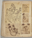 Album Gatteaux dit "musée imaginaire". Album factice à couverture en vélin. Feuillets de deux papiers différents du fait de l'usage d'un papier plus fort et moins homogène pour le premier feuillet, puis du folio 36 recto au folio 40 verso. Au total 599 dessins répartis sur les premiers 134 feuillets. 596 dessins collés sur les pages de l'album et 3 dessins exécutés à même les pages de l'album. 592 dessins rapportés exécutés sur calque et 4 dessins rapportés exécutés sur papier. 23 dessins exécutés uniquement au graphite sur papier ou calque. 24 dessins exécutés à l'encre brune et/ou noire sur traces de graphite.552 dessins exécutés à l'encre seule, majoritairement brune mais de qualités différentes, parfois plus grise, d'autres fois plus noire. Plusieurs ensembles de feuillets vierges : du folio 30 recto au folio 35 verso inclus ; du folio 65 verso au feuillet 68 recto inclus ; du feuillet 72 verso au 75 verso inclus ; du feuillet 129 recto au feuillet 130 verso inclus. Feuillets vierges ou coupés à partir du folio 135 verso. Annotation à la plume et à l'encre brune de la main de Jacques-Edouard Gatteaux sur la contre-garde de la couverture: " E. Gatteaux. Rue de Bourbon n° 36 / Paris". Dimensions de l'album : H. 21 cm.; L. 17 cm. ; épaisseur du dos environ 3,2 cm.