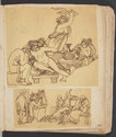 Album Gatteaux dit "musée imaginaire". Album factice à couverture en vélin. Feuillets de deux papiers différents du fait de l'usage d'un papier plus fort et moins homogène pour le premier feuillet, puis du folio 36 recto au folio 40 verso. Au total 599 dessins répartis sur les premiers 134 feuillets. 596 dessins collés sur les pages de l'album et 3 dessins exécutés à même les pages de l'album. 592 dessins rapportés exécutés sur calque et 4 dessins rapportés exécutés sur papier. 23 dessins exécutés uniquement au graphite sur papier ou calque. 24 dessins exécutés à l'encre brune et/ou noire sur traces de graphite.552 dessins exécutés à l'encre seule, majoritairement brune mais de qualités différentes, parfois plus grise, d'autres fois plus noire. Plusieurs ensembles de feuillets vierges : du folio 30 recto au folio 35 verso inclus ; du folio 65 verso au feuillet 68 recto inclus ; du feuillet 72 verso au 75 verso inclus ; du feuillet 129 recto au feuillet 130 verso inclus. Feuillets vierges ou coupés à partir du folio 135 verso. Annotation à la plume et à l'encre brune de la main de Jacques-Edouard Gatteaux sur la contre-garde de la couverture: " E. Gatteaux. Rue de Bourbon n° 36 / Paris". Dimensions de l'album : H. 21 cm.; L. 17 cm. ; épaisseur du dos environ 3,2 cm.