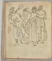 Album Gatteaux dit "musée imaginaire". Album factice à couverture en vélin. Feuillets de deux papiers différents du fait de l'usage d'un papier plus fort et moins homogène pour le premier feuillet, puis du folio 36 recto au folio 40 verso. Au total 599 dessins répartis sur les premiers 134 feuillets. 596 dessins collés sur les pages de l'album et 3 dessins exécutés à même les pages de l'album. 592 dessins rapportés exécutés sur calque et 4 dessins rapportés exécutés sur papier. 23 dessins exécutés uniquement au graphite sur papier ou calque. 24 dessins exécutés à l'encre brune et/ou noire sur traces de graphite.552 dessins exécutés à l'encre seule, majoritairement brune mais de qualités différentes, parfois plus grise, d'autres fois plus noire. Plusieurs ensembles de feuillets vierges : du folio 30 recto au folio 35 verso inclus ; du folio 65 verso au feuillet 68 recto inclus ; du feuillet 72 verso au 75 verso inclus ; du feuillet 129 recto au feuillet 130 verso inclus. Feuillets vierges ou coupés à partir du folio 135 verso. Annotation à la plume et à l'encre brune de la main de Jacques-Edouard Gatteaux sur la contre-garde de la couverture: " E. Gatteaux. Rue de Bourbon n° 36 / Paris". Dimensions de l'album : H. 21 cm.; L. 17 cm. ; épaisseur du dos environ 3,2 cm.
