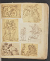 Album Gatteaux dit "musée imaginaire". Album factice à couverture en vélin. Feuillets de deux papiers différents du fait de l'usage d'un papier plus fort et moins homogène pour le premier feuillet, puis du folio 36 recto au folio 40 verso. Au total 599 dessins répartis sur les premiers 134 feuillets. 596 dessins collés sur les pages de l'album et 3 dessins exécutés à même les pages de l'album. 592 dessins rapportés exécutés sur calque et 4 dessins rapportés exécutés sur papier. 23 dessins exécutés uniquement au graphite sur papier ou calque. 24 dessins exécutés à l'encre brune et/ou noire sur traces de graphite.552 dessins exécutés à l'encre seule, majoritairement brune mais de qualités différentes, parfois plus grise, d'autres fois plus noire. Plusieurs ensembles de feuillets vierges : du folio 30 recto au folio 35 verso inclus ; du folio 65 verso au feuillet 68 recto inclus ; du feuillet 72 verso au 75 verso inclus ; du feuillet 129 recto au feuillet 130 verso inclus. Feuillets vierges ou coupés à partir du folio 135 verso. Annotation à la plume et à l'encre brune de la main de Jacques-Edouard Gatteaux sur la contre-garde de la couverture: " E. Gatteaux. Rue de Bourbon n° 36 / Paris". Dimensions de l'album : H. 21 cm.; L. 17 cm. ; épaisseur du dos environ 3,2 cm.