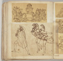 Album Gatteaux dit "musée imaginaire". Album factice à couverture en vélin. Feuillets de deux papiers différents du fait de l'usage d'un papier plus fort et moins homogène pour le premier feuillet, puis du folio 36 recto au folio 40 verso. Au total 599 dessins répartis sur les premiers 134 feuillets. 596 dessins collés sur les pages de l'album et 3 dessins exécutés à même les pages de l'album. 592 dessins rapportés exécutés sur calque et 4 dessins rapportés exécutés sur papier. 23 dessins exécutés uniquement au graphite sur papier ou calque. 24 dessins exécutés à l'encre brune et/ou noire sur traces de graphite.552 dessins exécutés à l'encre seule, majoritairement brune mais de qualités différentes, parfois plus grise, d'autres fois plus noire. Plusieurs ensembles de feuillets vierges : du folio 30 recto au folio 35 verso inclus ; du folio 65 verso au feuillet 68 recto inclus ; du feuillet 72 verso au 75 verso inclus ; du feuillet 129 recto au feuillet 130 verso inclus. Feuillets vierges ou coupés à partir du folio 135 verso. Annotation à la plume et à l'encre brune de la main de Jacques-Edouard Gatteaux sur la contre-garde de la couverture: " E. Gatteaux. Rue de Bourbon n° 36 / Paris". Dimensions de l'album : H. 21 cm.; L. 17 cm. ; épaisseur du dos environ 3,2 cm.