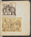 Album Gatteaux dit "musée imaginaire". Album factice à couverture en vélin. Feuillets de deux papiers différents du fait de l'usage d'un papier plus fort et moins homogène pour le premier feuillet, puis du folio 36 recto au folio 40 verso. Au total 599 dessins répartis sur les premiers 134 feuillets. 596 dessins collés sur les pages de l'album et 3 dessins exécutés à même les pages de l'album. 592 dessins rapportés exécutés sur calque et 4 dessins rapportés exécutés sur papier. 23 dessins exécutés uniquement au graphite sur papier ou calque. 24 dessins exécutés à l'encre brune et/ou noire sur traces de graphite.552 dessins exécutés à l'encre seule, majoritairement brune mais de qualités différentes, parfois plus grise, d'autres fois plus noire. Plusieurs ensembles de feuillets vierges : du folio 30 recto au folio 35 verso inclus ; du folio 65 verso au feuillet 68 recto inclus ; du feuillet 72 verso au 75 verso inclus ; du feuillet 129 recto au feuillet 130 verso inclus. Feuillets vierges ou coupés à partir du folio 135 verso. Annotation à la plume et à l'encre brune de la main de Jacques-Edouard Gatteaux sur la contre-garde de la couverture: " E. Gatteaux. Rue de Bourbon n° 36 / Paris". Dimensions de l'album : H. 21 cm.; L. 17 cm. ; épaisseur du dos environ 3,2 cm.