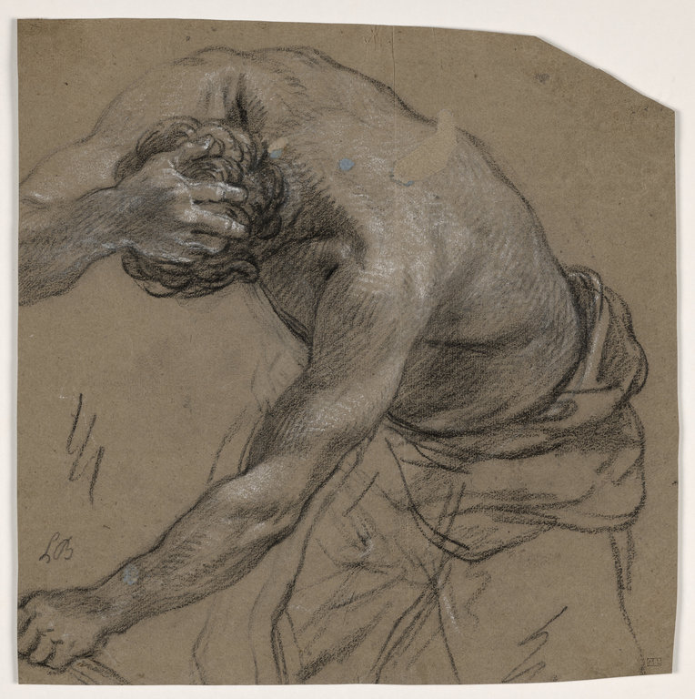 Figure penchée vers l'avant, la main droite sur la tête et tenant un bâton avec le bras gauche (folio 72, en haut)
