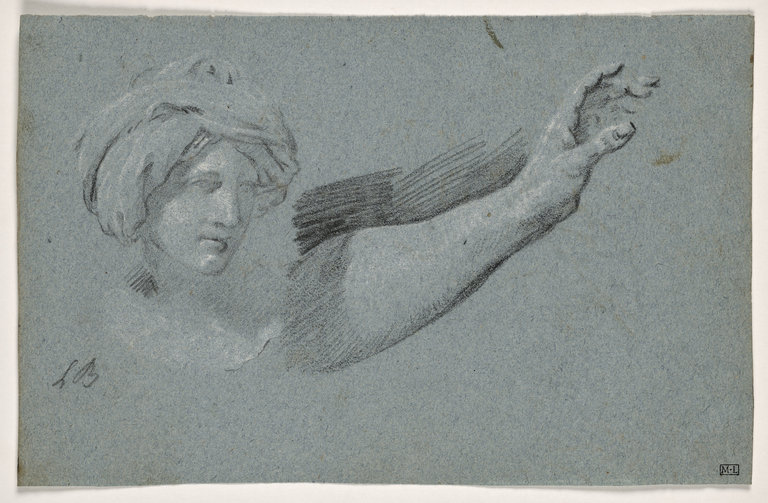 Tête portant un turban, tournée vers la droite et bras gauche étendu, paume ouverte (folio 157, en bas)